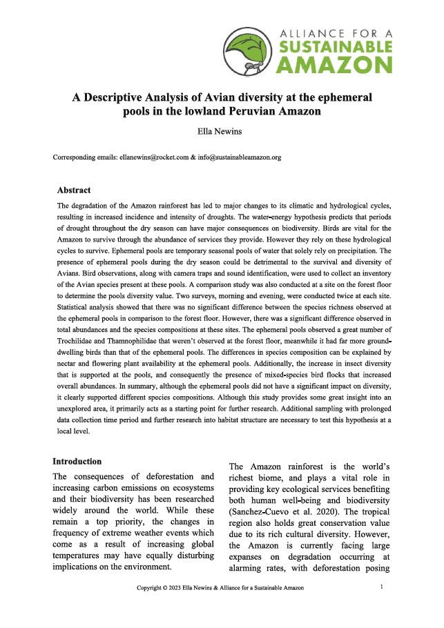 Every year we host a cohort of research interns at Finca Las Piedras who conduct field-based projects in areas ranging from biology and ecology to conservation, sustainability, and economic development. Encouraging and guiding our interns to publish their findings is a key objective of the internship program, both for their own professional development and so that we may continue to build upon their insights to advance research, reforestation, and education in southeastern Peru. Scroll down to see all of our published intern reports: